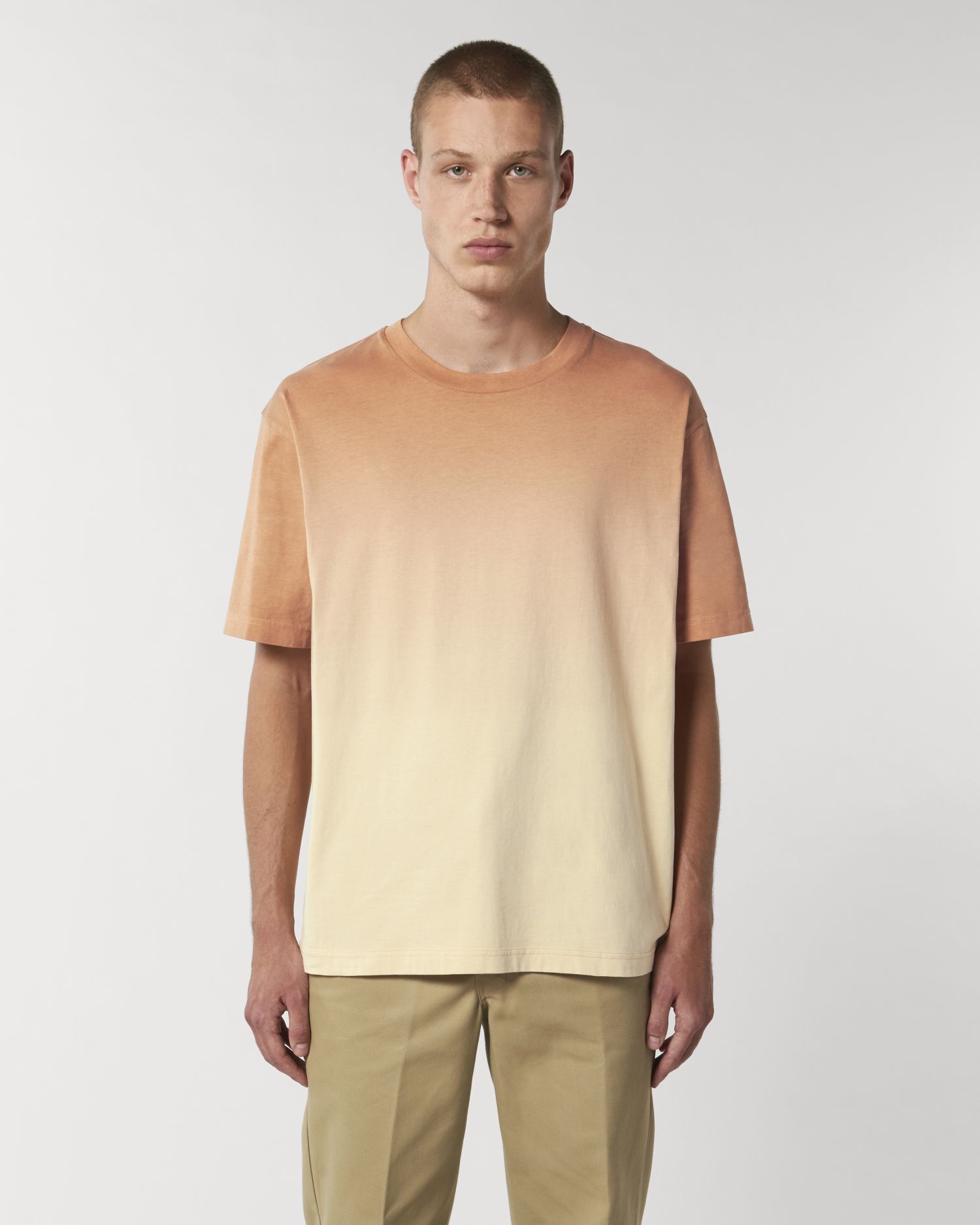Den lösa unisex-t-shirten med dip dye-tryck. Lös passform, rund hals, kortärmad, enkel jerseystickad. Monterad ärm 1x1 ribbkrage Bias inuti huvudtyget på halsen Bred dubbelsöm på ärmslut och fåll Produkt med dip dye-tryck, utseendet på varje plagg kan variera, det kan blekna, följ skötseletiketterna_ Läs utskriften noggrant rekommenderas_x000D