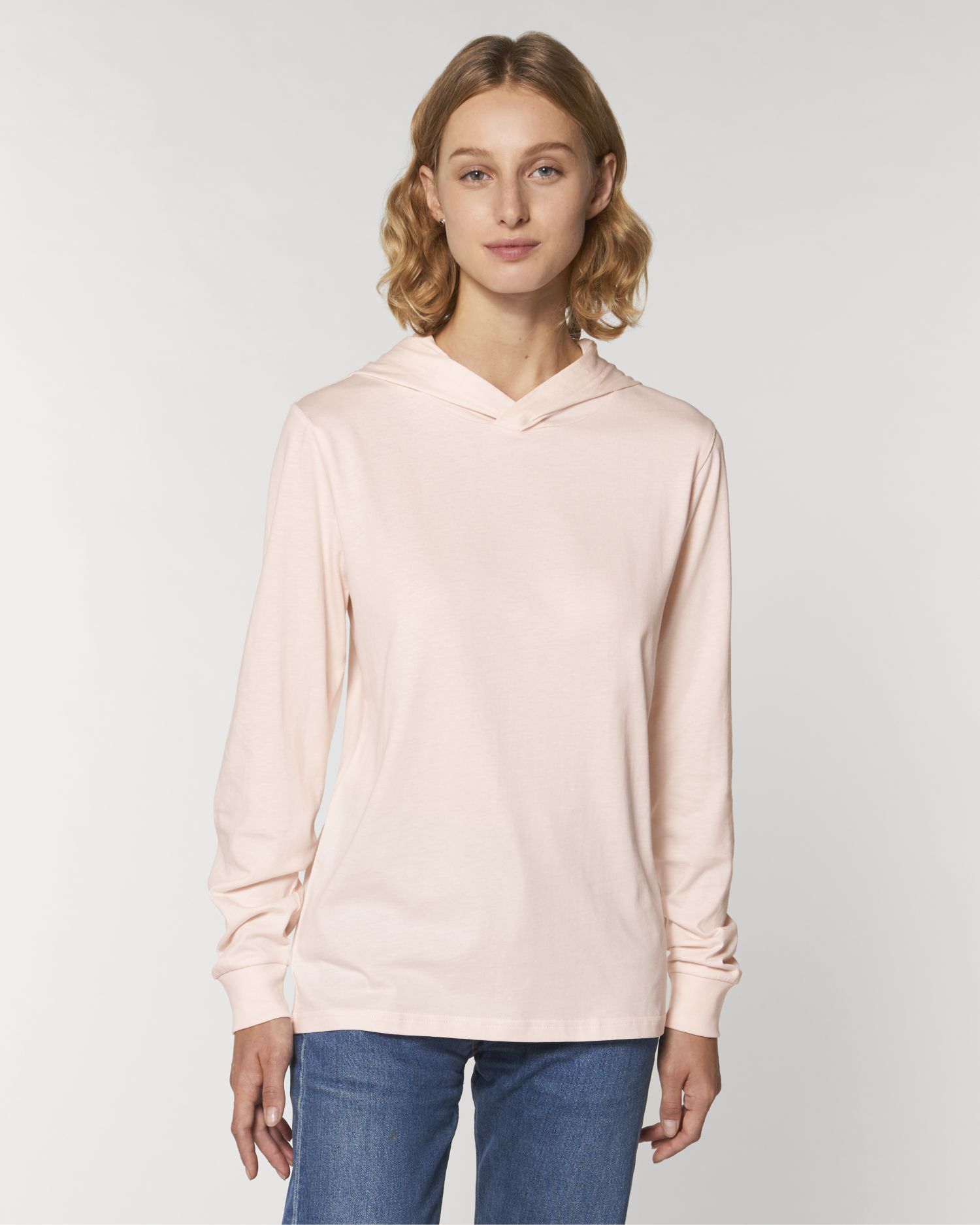 Den unisex t-shirten med huva. Normal passform, rund hals med huva, långärmad, enkel jerseystickad. Stängd ärm Huva fodrad med huvudtyg Invändig snedbindning av huvudtyg på halsen 1x1 ribb på ärmslut Bred dubbelsöm på fållen