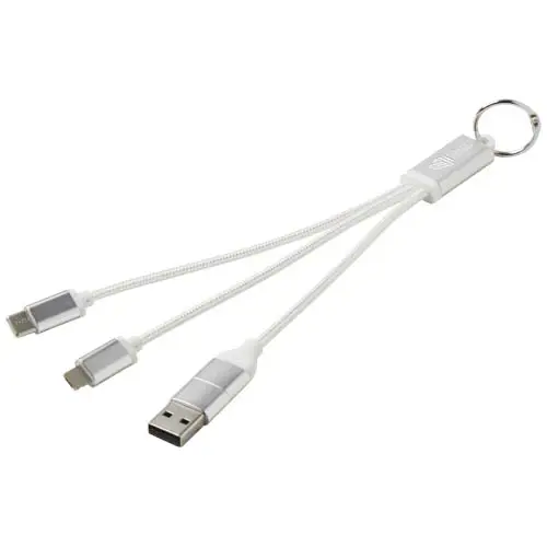 4-i-1 laddkabel till nyckelring tillverkad av återvunnen aluminium med en maxeffekt på 10 W. Tack vare USB-A- och typ-C-ingångskontakterna i kombination med typ-C- och Lightning/mikro-USB kombi-utgångskontakterna (stöder Apple iOS- och Android-enheter) kan du ladda de flesta smarttelefoner, kameror, powerbankar och öronsnäckor.