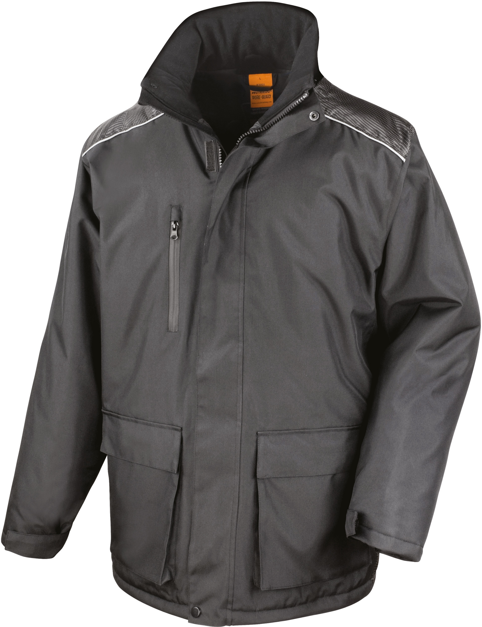 Exteriör: 100 % 300D Oxford polyester med PVC-beläggning. Foder: 100 % 210T polyestertaft. Isolering: 100% polyesterfyllning. Vattentät upp till 2000 mm. Vindjacka. Diamant quiltat foder. Tvåvägsdragkedja framtill med stormklaff med kardborrelås och tryckknappar. Stickad fodrad krage. Justerbar och avtagbar huva med dragkedja. Kontrasterande ok i Dobby-tyg. Reflekterande trim. Flera fickor: framfickor med knappslå och kardborre stängning, sidfickor för att hålla händerna varma, invändig bröstficka. Dragsko i fåll. Justerbara ribbstickade muddar med kardborreknäppning. Avtagbara avdragare på alla dragkedjor (inkluderar 4 färger av avdragare). Bred skärning som ger bra rörlighet. Motstånd mot ogynnsamma väderförhållanden, optimalt skydd. Isolerande mantel med termiskt underhåll.