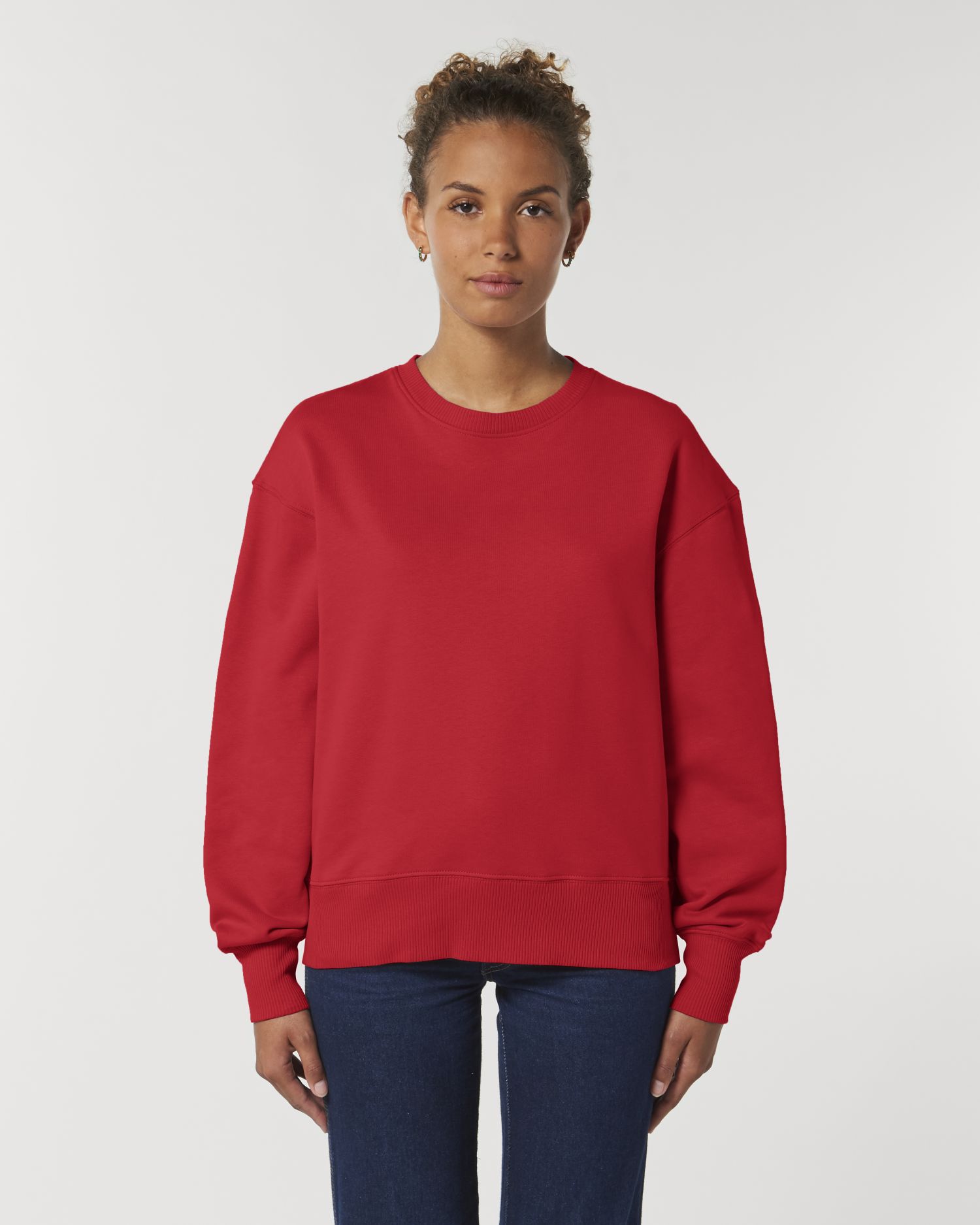 Den lösa unixex-tröjan med rund hals. Löst skuren, Rund hals, Långärmad, Borstad fleece. Stängda ärmar 2x2 ribb i halsen, ärmslut och nederkant Fiskbensbaksida i nacken Inre halvmåne i huvudtyg Enkelsöm i nacken Dubbelsöm på ärmhål och ärmslut