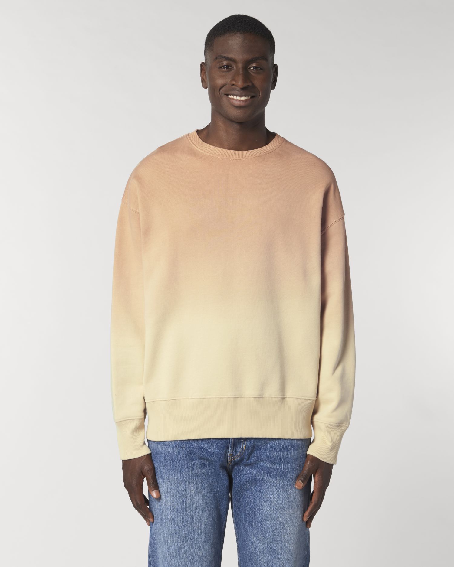 Den lösa unisextröjan med rund hals och dip dye-tryck. Löst skuren, Rund hals, Långärmad, Borstad fleece. Fitsed sleeve 2x2 ribb vid halsringning, ärmslut och fåll Inre fiskbensbias på halsen Inre halvmåne i huvudtyg Enkelstygn i halsen Dubbelsöm på ärmhål Dubbla stygn på ärmhål_x dyna, kan följt av varans, kant, 00000 instruktioner om skötseletikett Läs utskriftsrekommendationerna noggrant