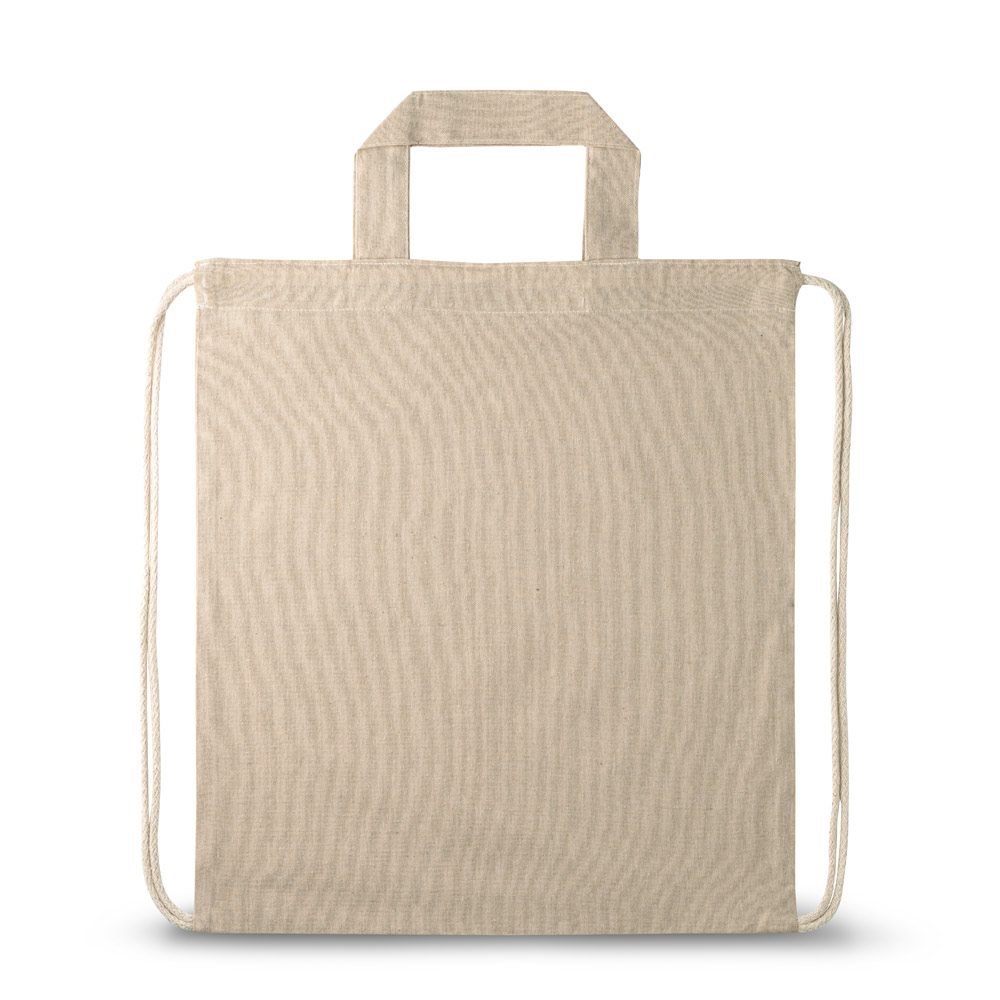 Ryggsäck i återvunnen bomull (140 g/m²), med 30 cm handtag och stängning med dragsko i bomull. 370 x 410 mm