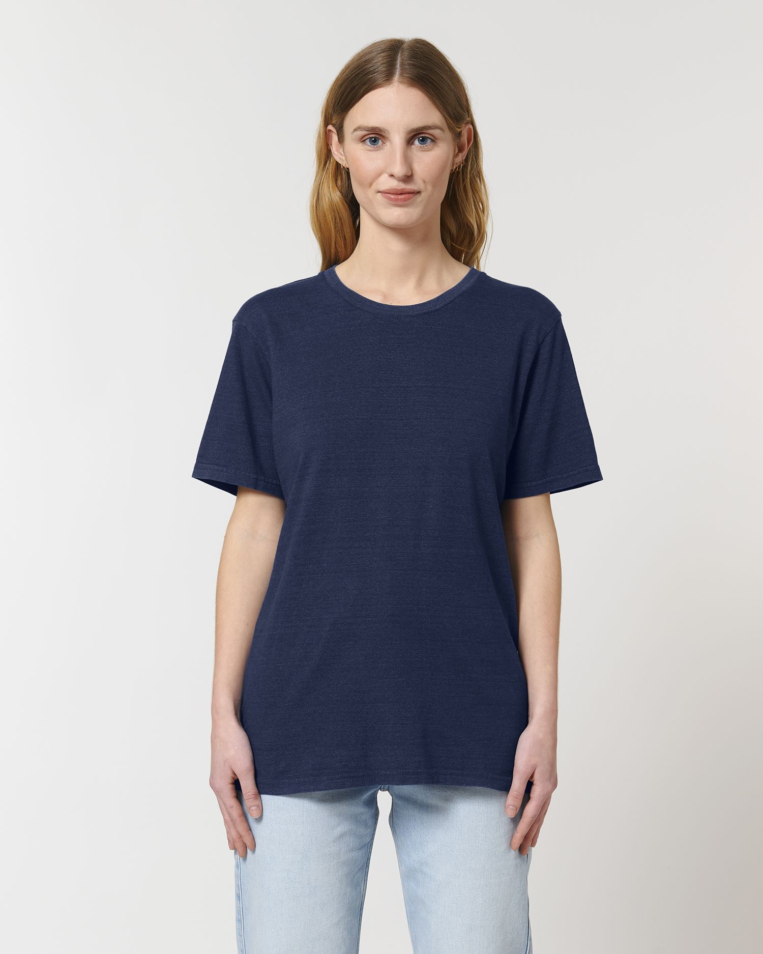 Denim-t-shirten för unisex. Normal passform, rund hals, kortärmad, enkel jerseystickad. Påsydd ärm